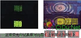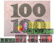 伪造者使用从社会上购置的荧光油墨来模拟真钞的荧光印记,荧光亮度明显低于真钞,颜色与真钞存在差异(见下图)。//by http://CiDu.Net/