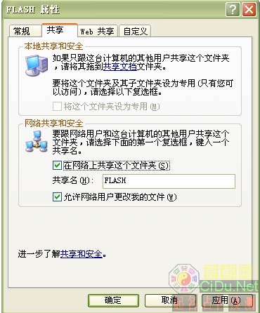 我们只要选中在网络中共享这个文件夹。共享以后,“允许网络用户更改我的文件”这一项是默认打开的,所以没有特殊必要的话,我们必须把它前面的勾去掉。//by http://CiDu.Net/