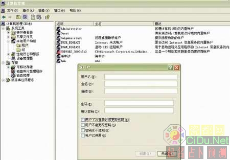 第二,设置帐户 进入控制面板的用户帐户,有计算机的帐户和来宾帐户。仅仅是开启GUEST帐户并不能达到多用户不同权限的目的。而且在高级文件共享中,Windows XP默认是不允许网络用户通过没有密码的账号访问系统。所以,我们必须为不同权限的用户设置不同的帐户。 假如网络其他用户的访问权限都一样(大多数情况都是这样),我们只需设置一个用户就行了。在用户帐户里,新建一个用户,由于我们必须考虑网络安全性,以所设用户必须为最小的权限和最少的服务,类型设置为“受限制用户”。如AAA用户。 在默认的情况下,xp新建帐户是没有密码的,上面说过,默认情况下xp是不允许网络用户通过没有密码的帐户访问的。所以,我们必须给刚刚添加的AAA用户填上密码。 添加用户也可以这样进行:打开 控制面板,“管理工具”,“计算机管理”,“系统工具”,“本地用户和组”,“用户”,在右边的窗口,按右键新建用户,如下图: