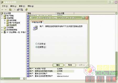 如果你希望网络用户通过此帐户访问系统而不需要密码,需要更改xp的安全策略: 打开控制面板,“管理工具”,“本地安全策略”,展开“本地策略-安全选项”,双击“账户: 使用空白密码的本地账户只允许进行控制台登录”,并停用它,然后确定。如下图: