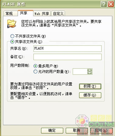 注意:在Home版的Windows XP里是没有组策略的。 第三、设置共享 做好以上的设置就可以设置共享了,点击一个文件夹,属性,共享选项卡,嘿嘿,跟刚刚的不同了吧,下面还多了个权限的按钮。如下图: