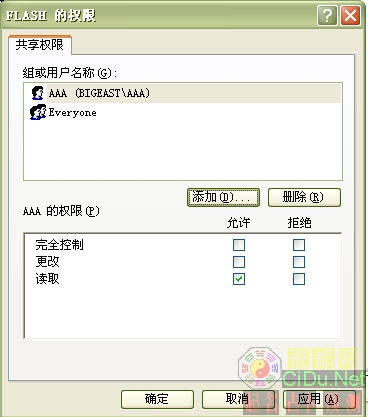 这设置不安全,所以我们要把EVERYONE删除了。 下面添加AAA的权限,按“添加”,查找用户名“AAA”,确定之后就组和用户中就有了,如下图:  图10