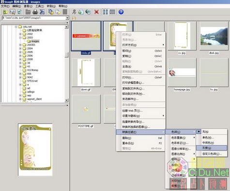 启动SnagIt 8,点击“SnagIt图库浏览器”(图1)。SnagIt图库浏览器很像是ACDSee的主界面,不过其工具栏中有一排特殊的工具按钮。在左边的目录树中打开需要批量转换的照片(图2)并且全部选中,然后点击“工具——批量转换向导”(或直接点击工具栏中的“批量转换向导”按钮)。接下来按“下一步”,在“转换过滤”中点击“修改”按钮,选择“颜色深度——灰度”(图3)。再按下一步,并设置好输出路径和文件格式就可以了。很快就可以看到一批一批地黑白照片被“制造”出来了(图4),节省下来的时间就留给你慢慢去欣赏吧!