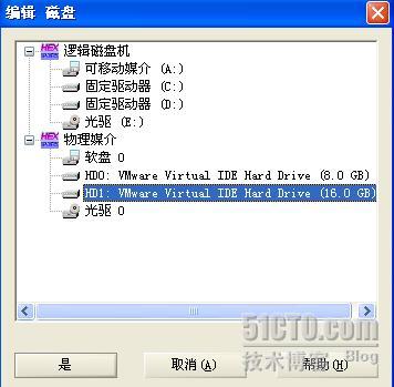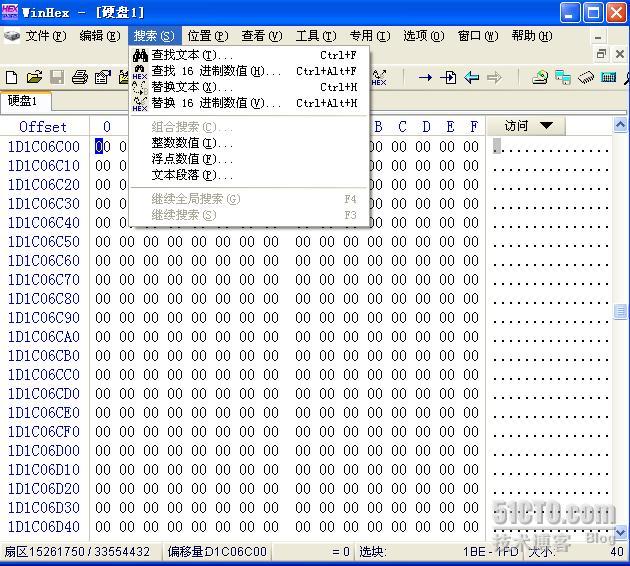 启动Winhex,在工具菜单中选择“磁盘编辑器”,如下图所示,选择打开第二块物理硬盘HD1(wmware搭的实验环境)。