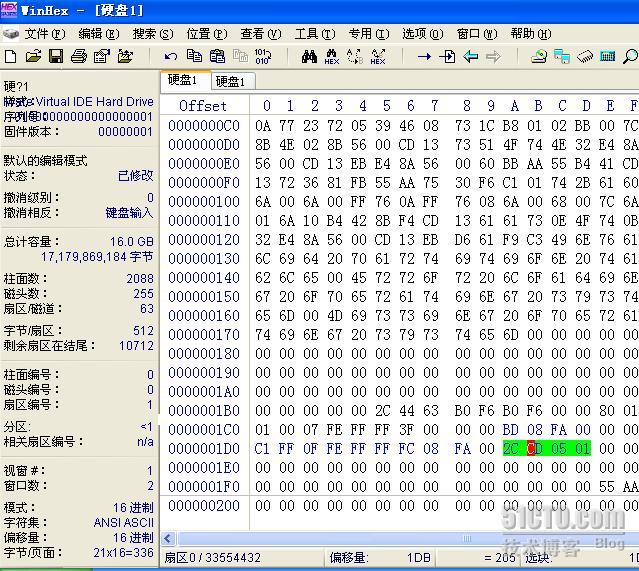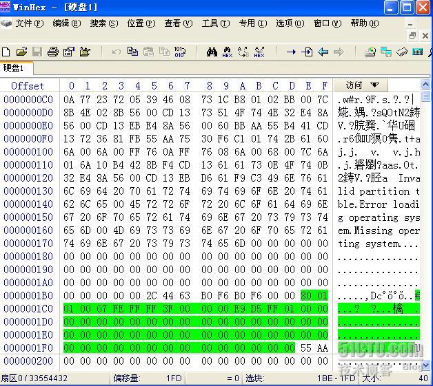 Winhex打开了物理硬盘,如下图所示就是0扇区的内容,0扇区内容分为三部分,引导程序,分区表和55AA的结束标志。图中绿色部分就是分区表,由于现在硬盘中只有一个分区,因此分区表中只有一项。