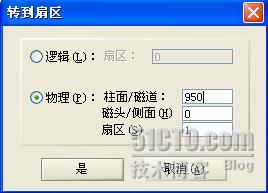 好了,首先定位到950柱面0磁头1扇区,我们准备从这里开始搜索,在Winhex的“位置”菜单中选择“转到扇区”,如下图所示,填入参数是950/0/1。再次声明,950柱面只是一个凭经验估算的结果。