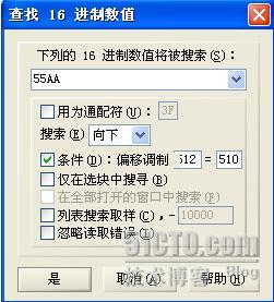 如下图所示,我们输入了搜索参数,搜索的16进制数值为55AA,搜索方向是向下,这是告诉Winhex从950柱面向后搜索。条件设为从偏移510开始,因为1个扇区有512字节,编号从0字节到511,55在510位置,AA在511位置。
