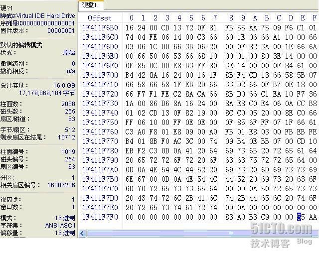 再向下找到的扇区就很象我们的目标了,如下图所示,这个扇区中有一个分区表,而且位置在1020柱面0磁头1扇区,和我们估算的1025柱面相差无几,凭经验基本可以认定这就是我们要找的目标。