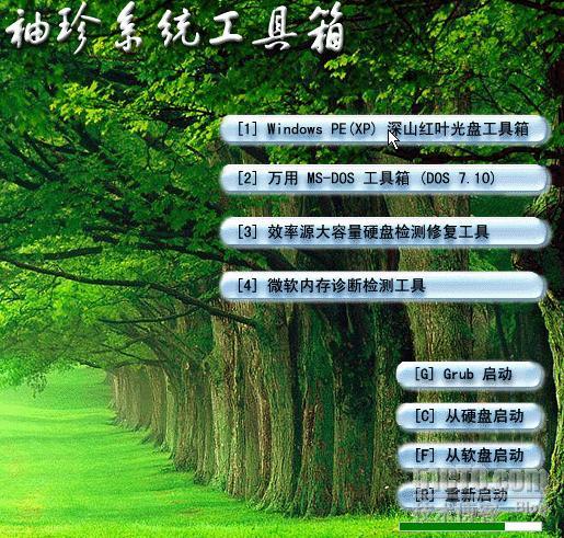 把硬盘恢复到故障状态,在计算机中放入深山红叶的启动光盘,如下图所示,出现了深山红叶的启动界面,我们选择第二项“万用MS-DOS工具箱“。