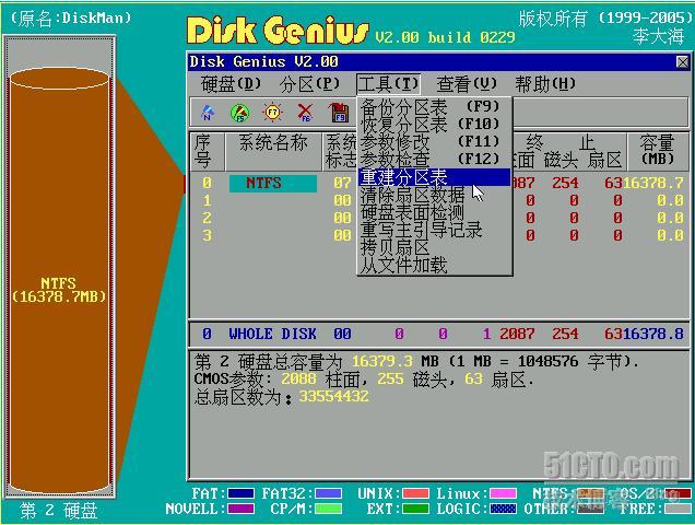 启动Diskgen后,我们首先在“硬盘”菜单中选择第2硬盘,因为我们准备恢复的硬盘是计算机中的第二块硬盘。如下图所示,第二块硬盘中只有一个分区。我们准备重建分区表,在“工具”菜单中选择“重建分区表”。