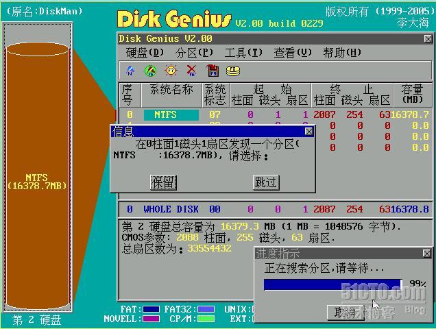 Diskgen首先找到了目前的第一个分区,这个分区结果是误Ghost后形成的,不是我们所希望的,因此选择“跳过”。
