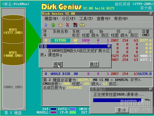 Diskgen继续向下搜索,速度很快,如果Diskgen找到了一些分区,但都离1025柱面较远,很有可能是以前分区遗留下来的,我们通通选择“跳过”。直到如下图所示,Diskgen找到了1020柱面的扩展分区,这是我们需要的,点击“保留”。这样,Diskgen在重建分区表时就会为这个扩展分区自动创建一个分区项。