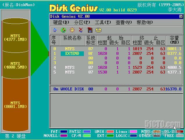 好了,假定我们找到的1020柱面0磁头1扇区就是扩展分区的起点,那我们就可以判断原先的C分区是从0柱面1磁头1扇区开始,到1019柱面254磁头63扇区结束。那扩展分区结束在什么地方呢?从分区表中的第二项可以知道答案,分区表的第二项描述了第二个扩展分区的起点和终点,第二个扩展分区的终点就是我们要找的扩展分区的结束位置。从分区表来看,第二个扩展分区的起点距当前扇区有7D 04 7E个扇区,大小是88 C8 AE个扇区。经过计算,扩展分区的终点是2087柱面254磁头63扇区。说到这儿,要对一些朋友说声抱歉了,这些计算涉及到分区原理,如果以前没有接触过,确实不容易看懂。现在大家如果理解起来有问题,可以参考第二种方法。